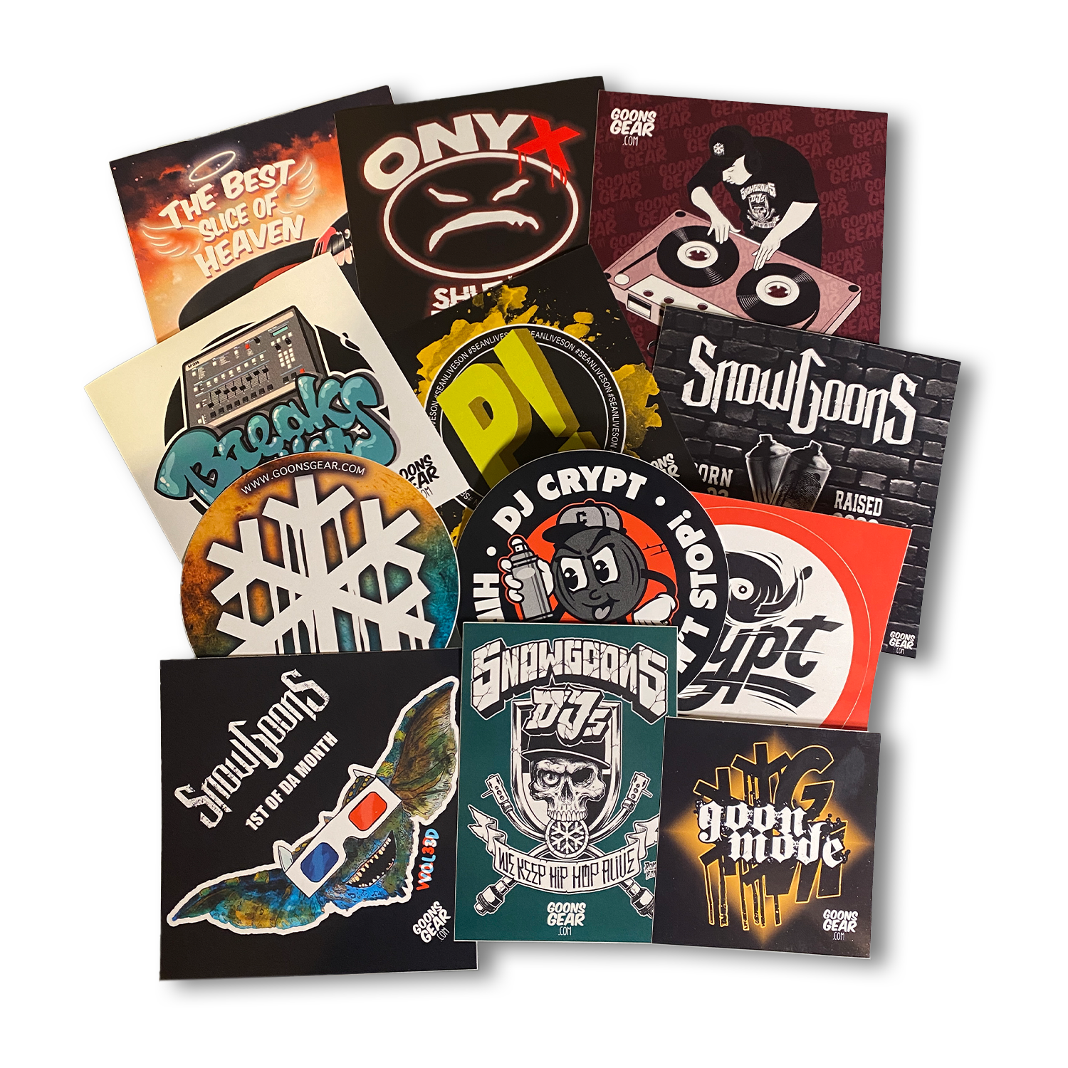 Exclusive GoonsGear Stickerpack with Stickers by Snowgoons, Onyx, Sean P, DJ Crypt, 90s Hip Hop and more.