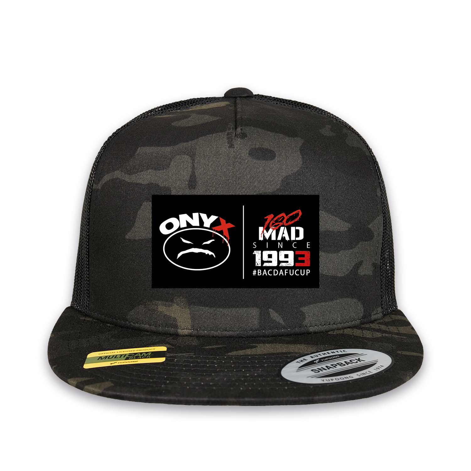 New Onyx – Camo Trucker Snapback Hat with the 1993 BacDaFucUp Patch on the front.